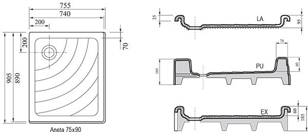 Vanička Aneta je vhodná pre sprchovacie priestory 75 x 90 cm riešené sprchovými kútmi ASRV3-75 + ASRV3-90, SRV2-S 75 + SRV2-S 90 alebo sprchovými dverami ASDP3-90, SDZ3-90, SDOP-90, BLRV2, PDOP1-90, SMSD2-90, BSD2-90.