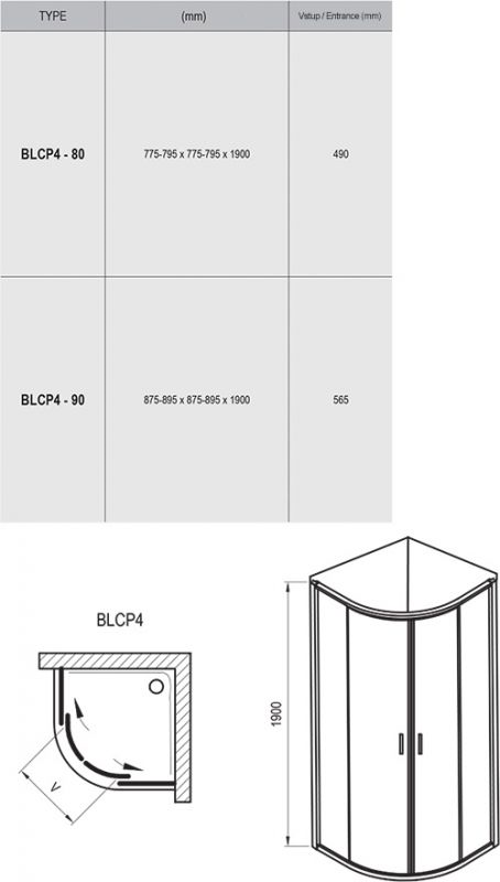 Štvrťkruhový sprchový kút Ravak BLIX BLCP4-80, Rádius R550, lesklý chróm/sklo Transparent