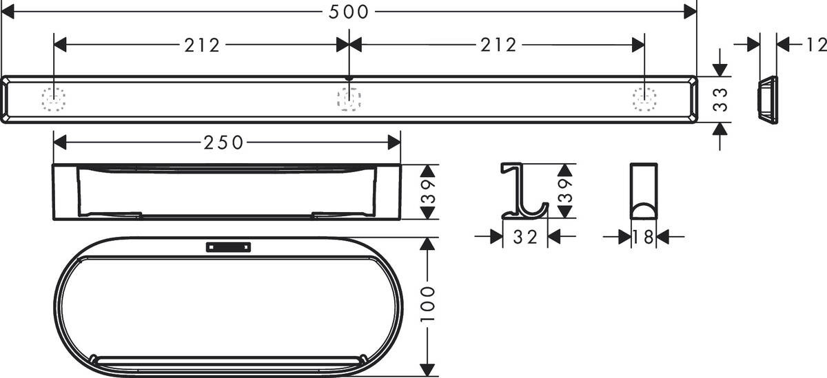 – obsahuje: nástenná tyč, polička, stierka, jednoduchý háčik