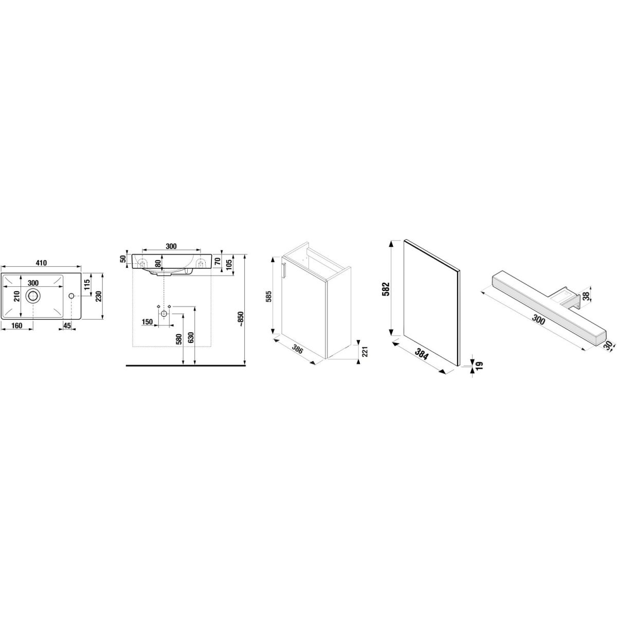 – rozmery skrinky vrátane umývadielka: 410 x 655 x 230 mm