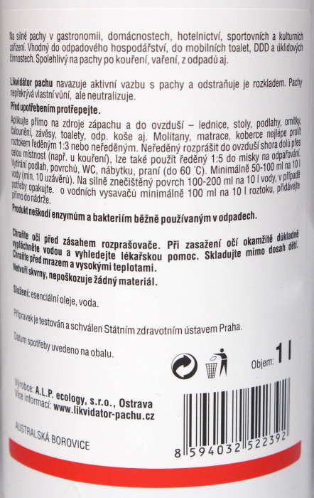 Jedná sa o úplne prírodný – zdravotne nezávadný prípravok, ktorý zápach nielen neutralizuje, ale vďaka prírodným esenciálnym olejom príjemne prevonia okolitý vzduch.