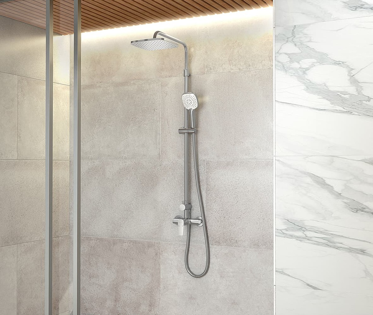 Set obsahuje nástennú sprchovú batériu s horným vývodom a rozstupom 150 mm s kvalitnou a odolnou keramickou kartušou KEROX 35 mm s predĺženou 7 ročnou zárukou. Prvotriedne chrómové prevedenie. Súčasťou balenia je kovová sprchová hadica 150 cm, hlavová sprcha 230 x 230 mm, 3-polohová ručná sprcha a posuvný jazdec s držiakom ručnej sprchy. Set je výškovo nastaviteľný 1035 – 1225 mm. Umožňuje nastaviť aj odchýlenie vrchného úchytu od steny v rozmedzí 50 – 80 mm. Hlavová sprcha obsahuje šetriaci regulátor prietoku vody na max 12 l/min a je vybavená EASY CLEAN tryskami pre jednoduché čistenie.