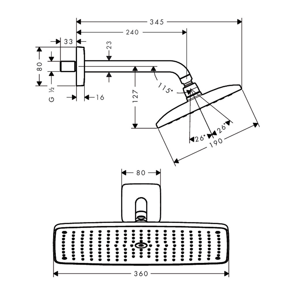 – veľkosť sprchovej hlavice: 360 x 190 mm