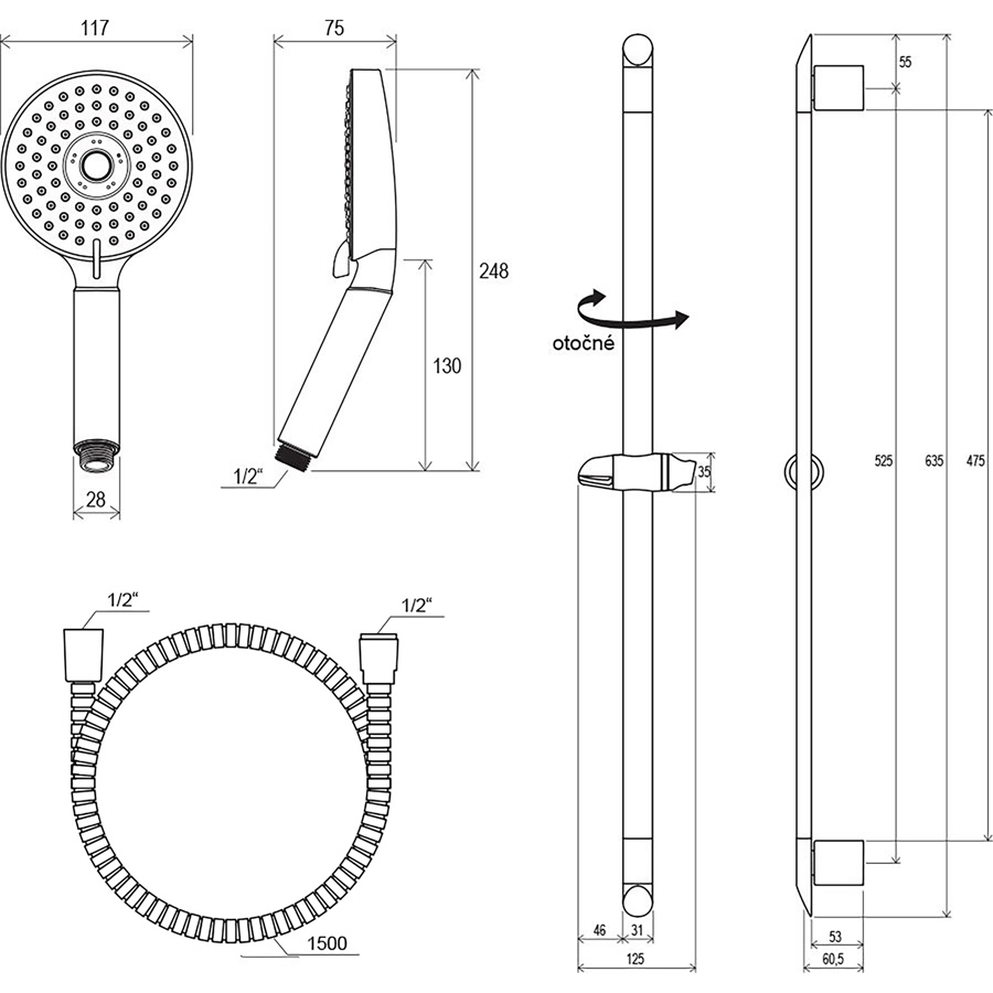 • rozmery: hadica z odolného plastu 150 cm, ružica plochá s 3 funkciami o priemere 118 mm, tyč s posuvným držiakom sprchy o dĺžke 63 cm