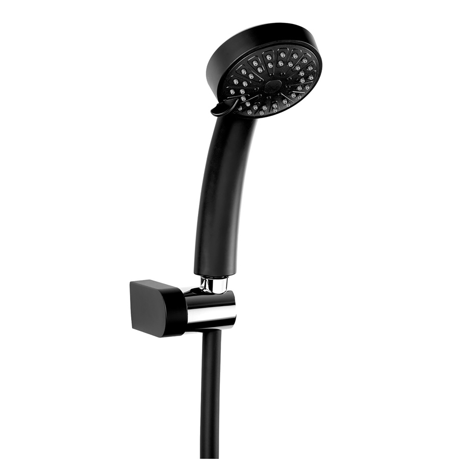 Sprchová súprava pre vaňové batérie v prevedení čierna-mat obsahuje 3-polohovú ručnú sprchu, kĺbový držiak sprchy a plastovú flexibilnú sprchovú hadicu s anti-twist systémom v dĺžke 150 cm