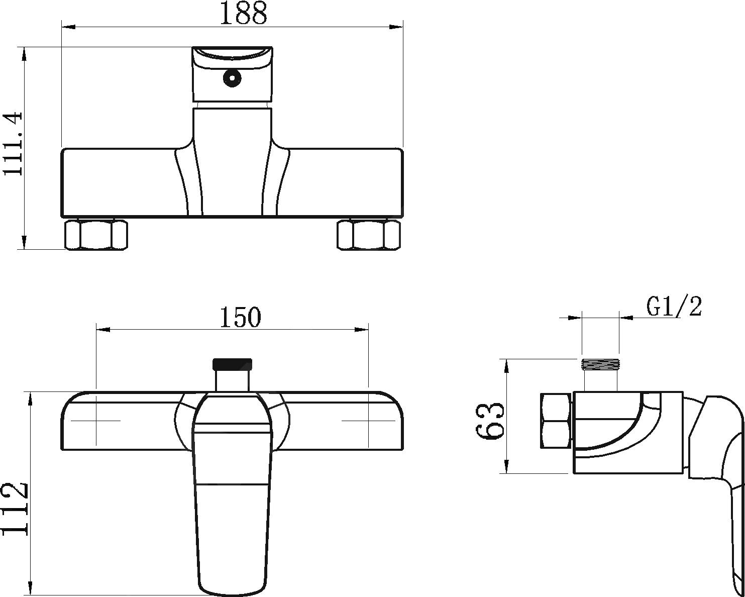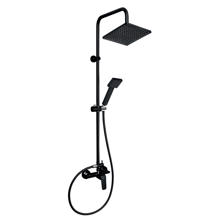 Prvotriedne prevedenie čierna-mat. Set obsahuje nástennú sprchovú batériu s vrchným vývodom a rozostupom 150 mm s odolnou, keramickou kartušou 35 mm s 5 ročnou zárukou, plastovú hadicu 150 cm, hlavovú sprchu 200 x 200 mm, ručnú sprchu a posuvný jazdec s držiakom ručnej sprchy. Set umožňuje nastaviť odchýlenie vrchného úchytu od steny v rozmedzí 60 – 80 mm.