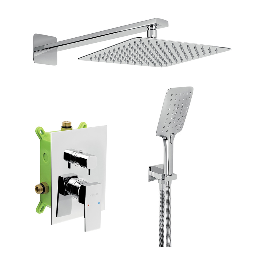 Sprchová podomietková sada s príslušenstvom. Box je dodávaný spolu s krytom a ovládacou pákou. Sada obsahuje podomietkovú sprchovú batériu s kvalitnou keramickou kartušou s 5 ročnou zárukou a šikovným keramickým prepínačom, kovovú hadicu 150 cm, ramienko zo zdi v dĺžke 400 mm, hlavovú sprchu vo SLIM dizajne v rozmere 250 x 250 mm, úspornú ručnú sprchu a hranatý stenový vývod vody s držiakom na ručnú sprchu.
