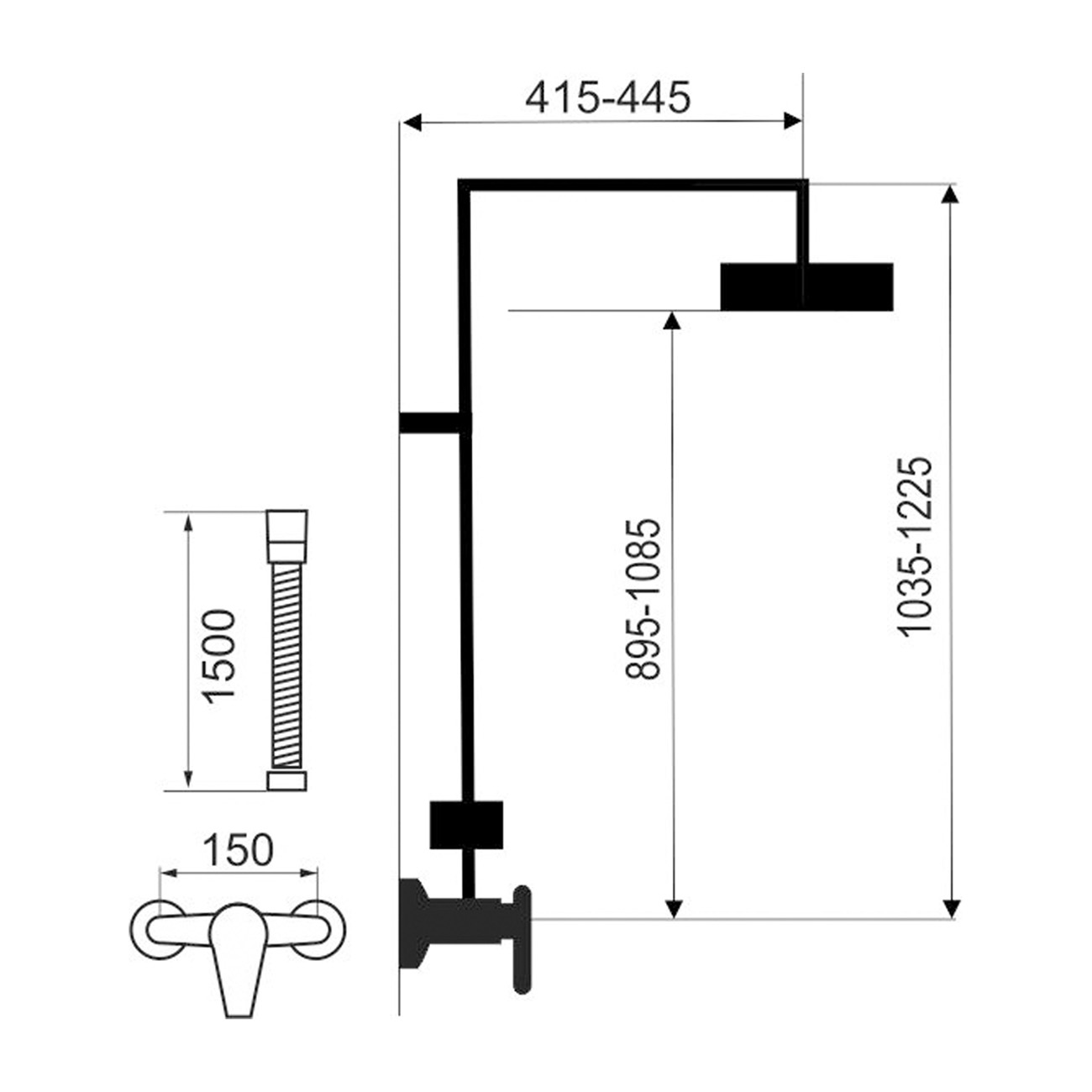 Výška sprchového setu 1035 – 1225 mm, vzdialenosť od steny 50 – 80 mm.