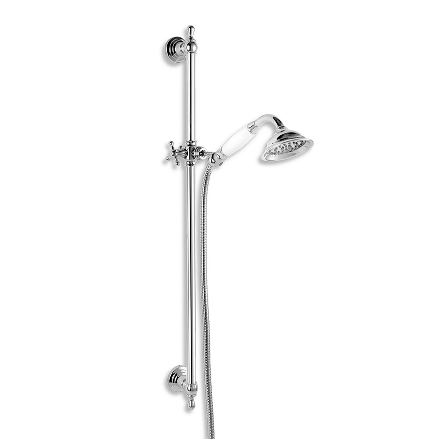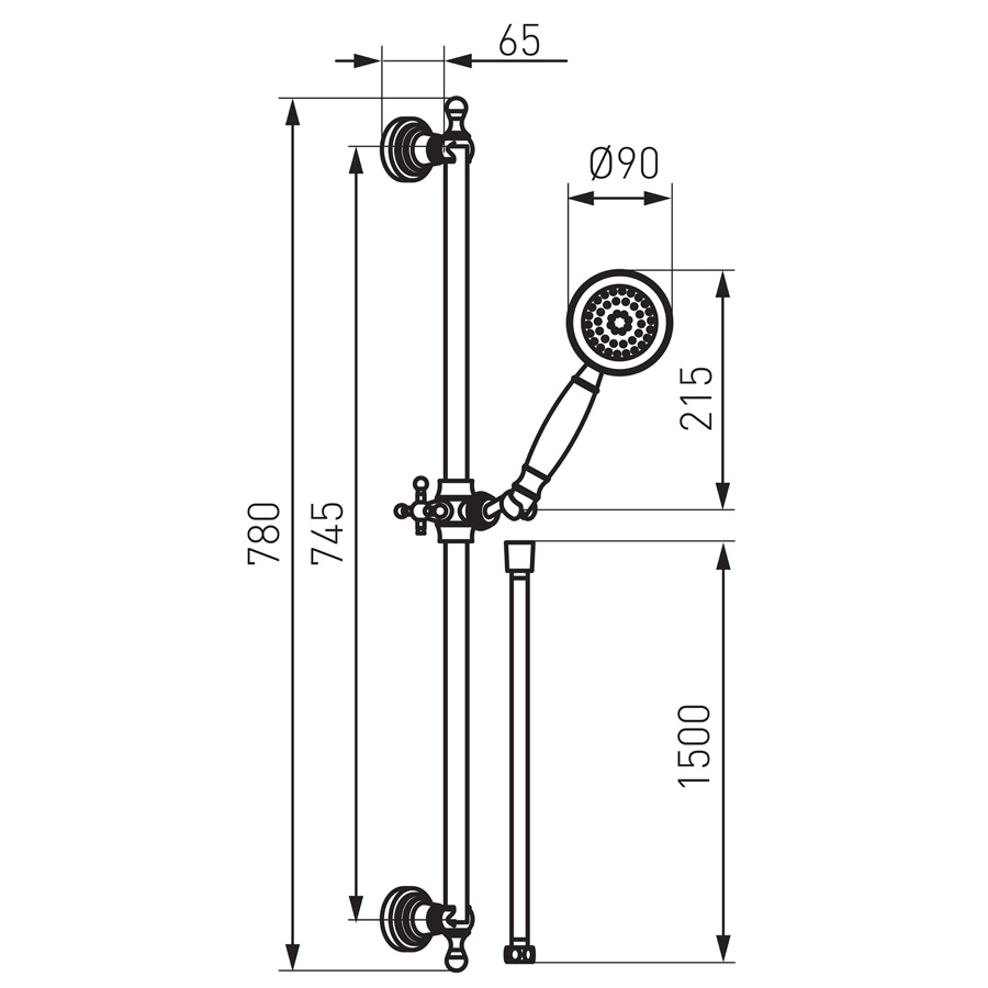 Sprchová súprava pre sprchové batérie obsahuje 1-polohovú ručnú sprchu, posuvný držiak sprchy v dĺžke 780 mm a kovovou sprchovú hadicu v dĺžke 150 cm. Rozstup montážnych otvorov 745 mm