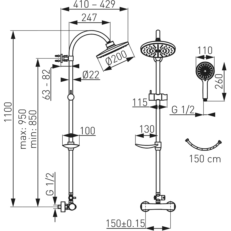 Prvotriedne chrómové prevedenie. Set obsahuje termostatickú batériu s rozostupom 150 mm. Súčasťou balenia je hadica 150 cm, hlavová sprcha s priemerom 200 mm, 3-polohová ručná sprcha a posuvný jazdec s držiakom ručnej sprchy. Výška setu je 1100 mm. Umožňuje nastaviť odchýlenie vrchného úchytu od steny v rozmedzí 50 – 80 mm.
