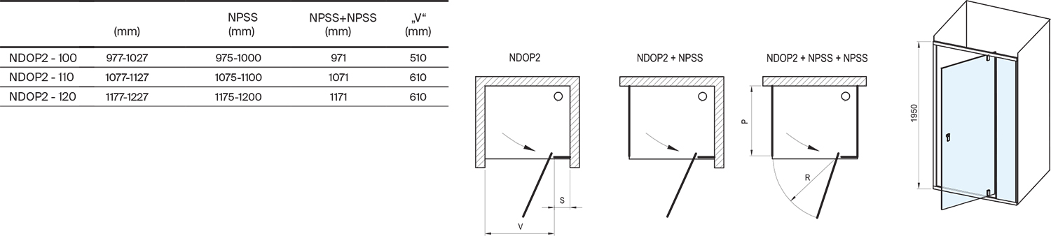 Výrobok sa skladá z jedného rovného pevného dielu a jedného rovného otočného dielu, ktorý tvorí dvere. Otočením výrobku o 180° získate ľavý alebo pravý variant otvárania dverí. Montuje sa do obloženého rohu kúpeľne (ideálne do vymurovanej niky alebo v kombinácii s pevnou stenou NPSS) na vaničky Ravak Gigant Pro, Gigant Pro Chrome alebo priamo na podlahu so zabudovaným odtokovým žľabom či podlahovým vpustom. Kombináciou s dvoma pevnými stenami typu NPSS vytvoríte sprchový kút v tvare „U“. Použitím rozširovacieho profilu NNPS možno výrobky rozšíriť o 20 mm, preto sa dokonale prispôsobia stavebným nerovnostiam až o 4 cm na každej strane.