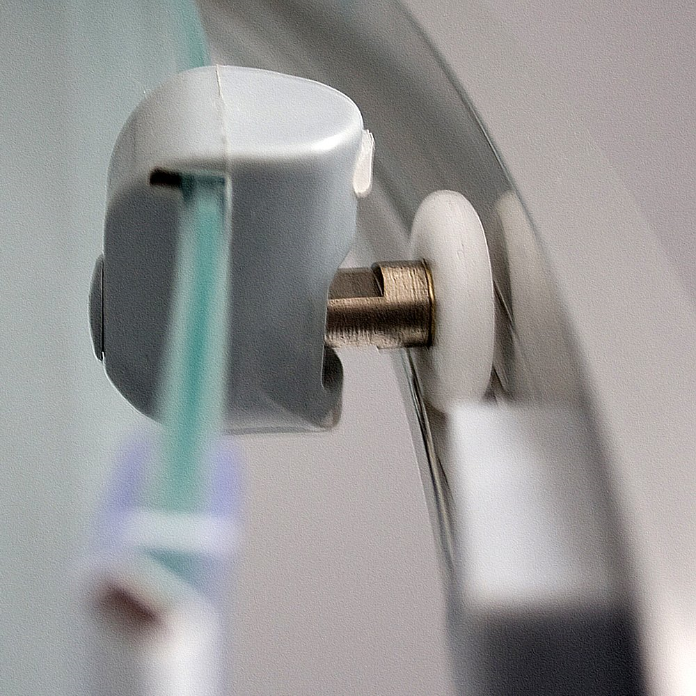 „Kvalitný horný pojazd sprchových dverí“ />Sprchový box disponuje nadčasovými hliníkovými bielymi profilmi a 4 mm výplní bezpečnostných skiel v prevedení Transparent. Zadné steny vyrábame vo farbe Green Satinato (veľmi svetlá zelená). Dvojdielne dvere sprchového boxu sú posuvné a jazdí po kvalitných koľajkách. Dvere zdobia minimalistické, ale napriek tomu krásne držadlo.