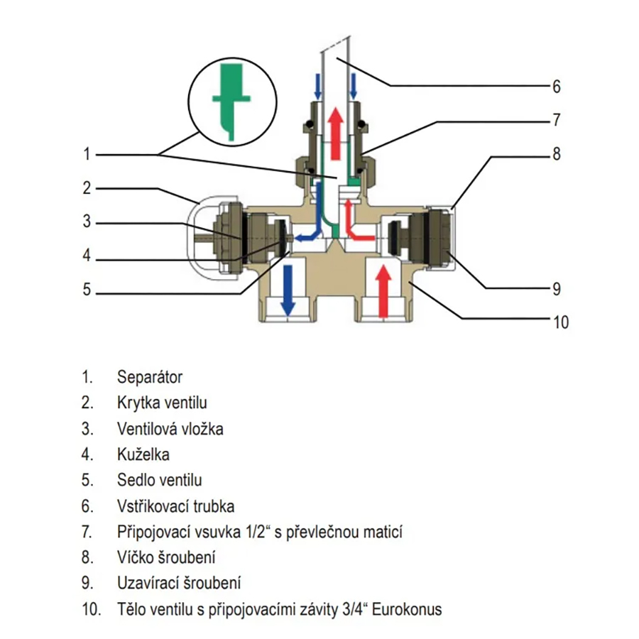 Vďaka konštrukcii rozdeľovacej vložky a vstrekovacej rúrky je možné pripojiť vykurovacie