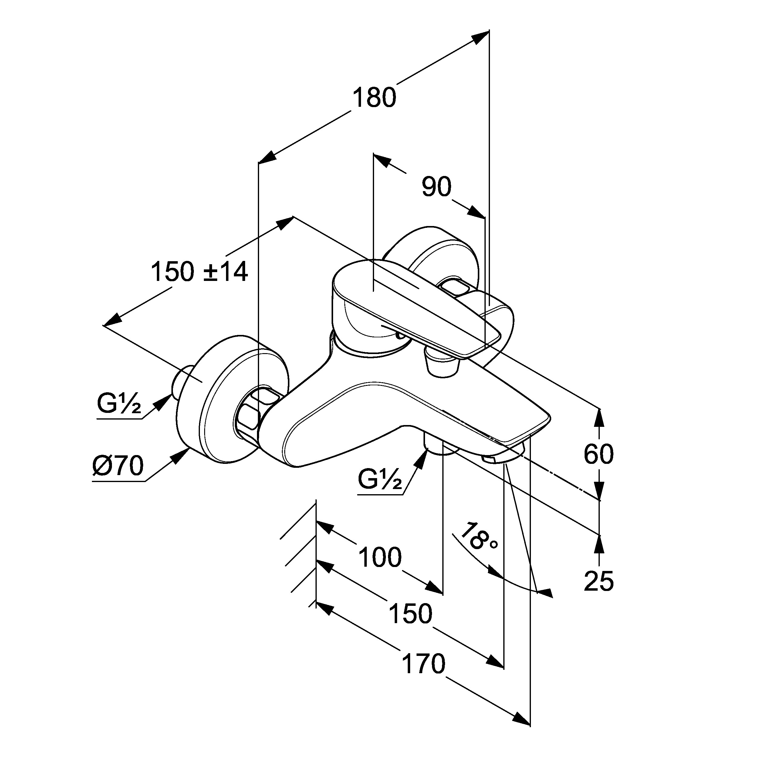 Páková nástenná vaňová batéria bez sprchového setu. V chrómovom prevedení. Rozstup batérie 150 mm.