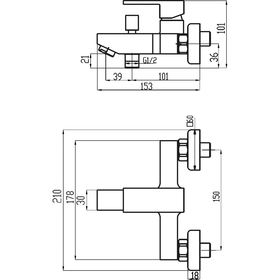 Vaňová nástenná batéria bez sprchovej súpravy 150 mm