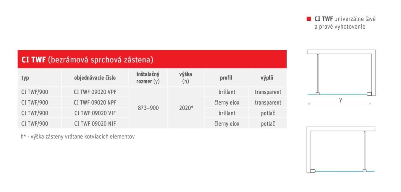 Veľkopriestorová bezrámová sprch. zástena CI TWF 900×2000 mm