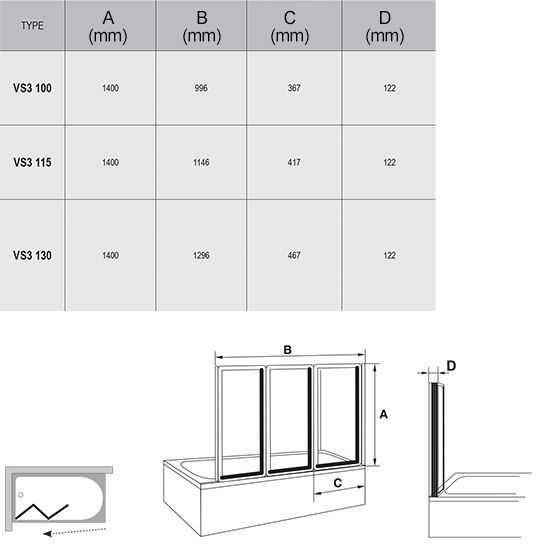 Zástena sa skladá z troch pohyblivých dielov, ktoré možno úplne zložiť do vnútorného priestoru nad vaňu. Vaňovú zástenu možno inštalovať na vaňu BeHappy IIa k obdĺžnikovým vaniam s rovným horným lemom (City, City Slim, Formy 01, Formy 02, 10°, Chrome, Classic, Campanula II, Vanda II) alebo na akúkoľvek klasickú obdĺžnikovú vaňu s rovným horným lemom. Štandardná výška zásteny je 1400 mm. Vaňová zástena VS3 100 je k vani BeHappy II 150 / 160, VS3 115 k vani BeHappy II 170. Vaňová zástena VS3 100 má v zloženom stave šírku 340 mm, k VS3 115 má šírku 392 a VS3 130 má šírku 444 mm. Otočením vaňovej zásteny VS3 o 180° získame variantu vstupu sprava či zľava. Vaňovú zástenu vieme riešiť na mieru.